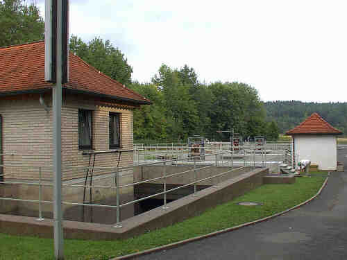 Altes Regenrückhaltebecken (im Hintergrund Belebungsbecken und Gebläseraum)